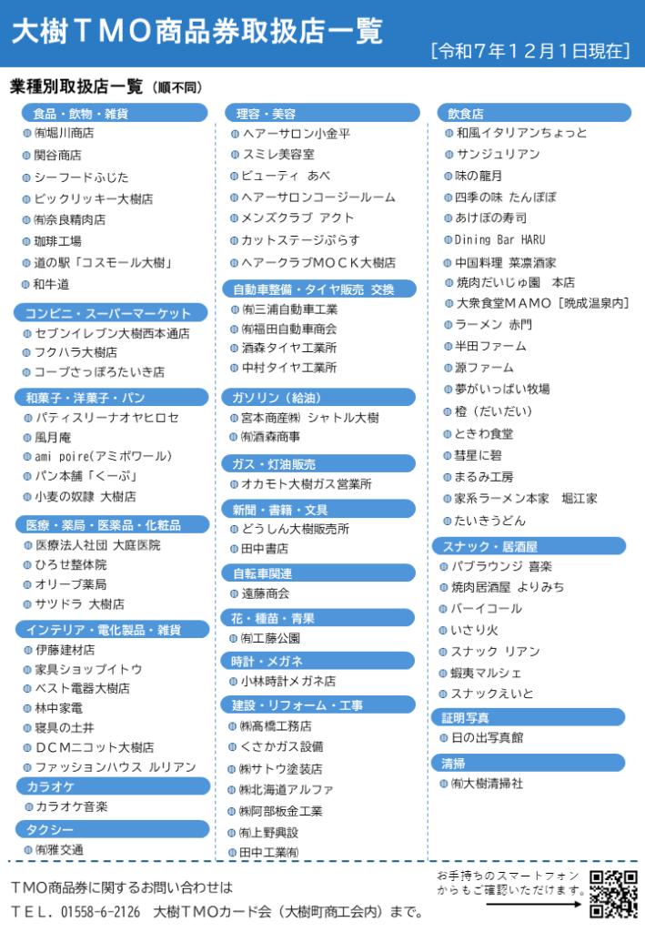 TMO商品券 取扱店舗 一覧(R7年12月17日現在)